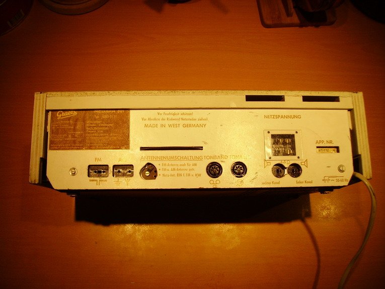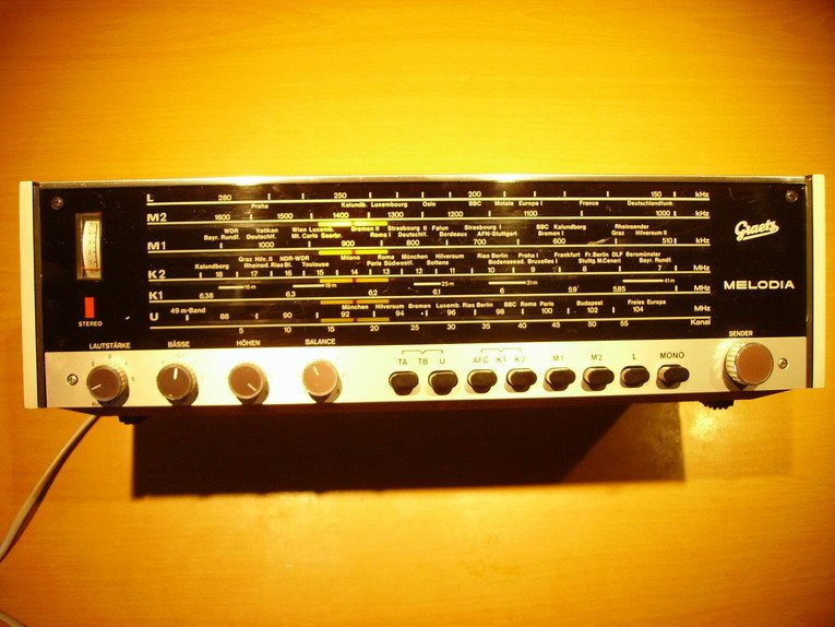 Amplituner z 1770 lub 1971 roku.Graetz produkował doskonale radia lampowe a ten model był chyba pierwszym tranzystorowym amplitunerem firmy.Rozbudowana część radiowa a skala wypełnia prawie cały przód radia.Ciekawie rozwiązano oświetlenie skali tylko przy pomocy 2 żarówek miniaturowych 7 V.Jedna to lampką stereo tradycyjnie czerwona a druga nad wskazówką skali rozświetla żółta płytkę o szerokości 40 mm,tworząc żółtawy pas z cienką czerwona pionową linią ,ładnie kontrastujący z biało- czarną skalą.Całość uzupełnia drewniana skrzynia laminowana w kolorze biało szarym.Stonowany design ,nienachalny a ciekawy.